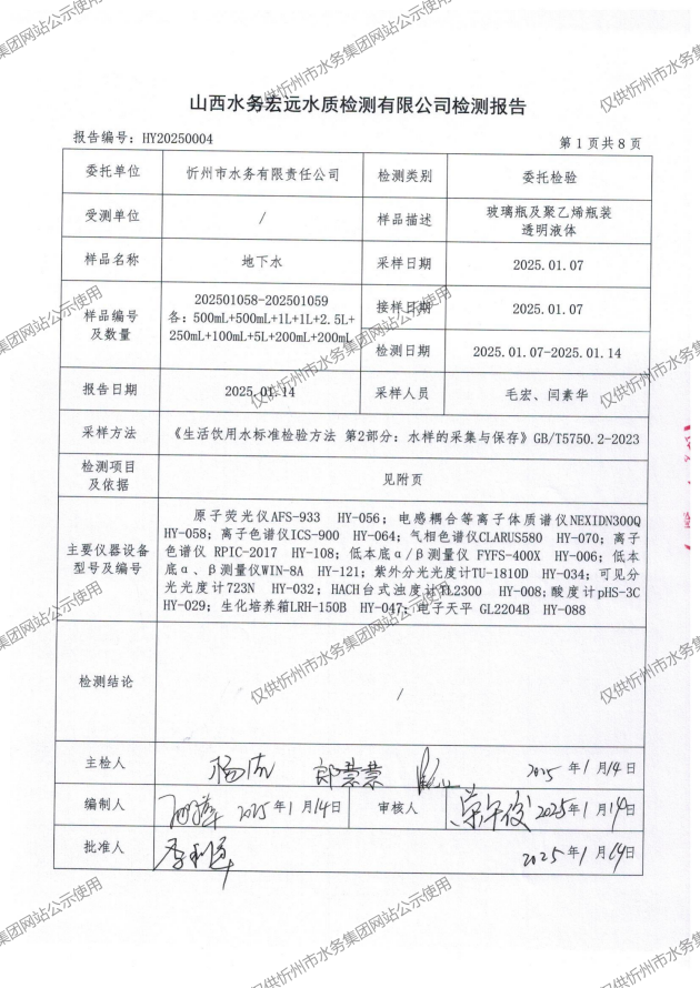 忻州城区公共供水水源水、出厂水、管网水、管网末梢水2025年01月份水质信息公示