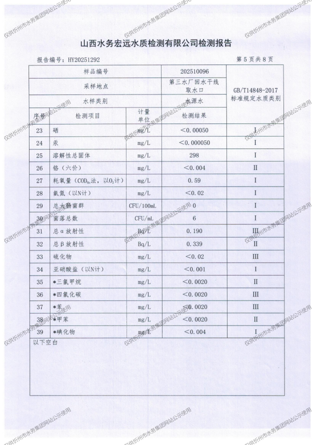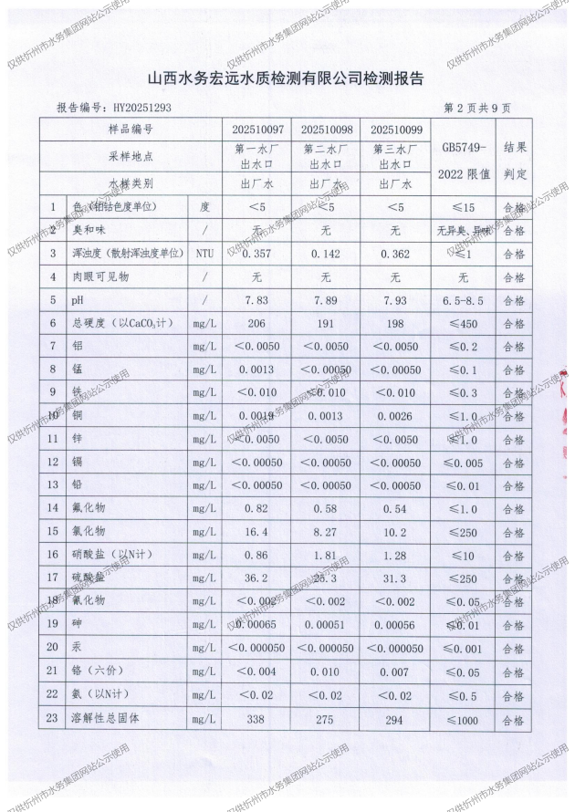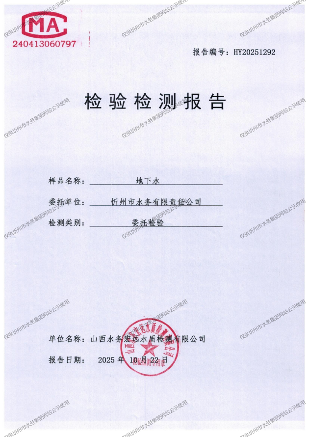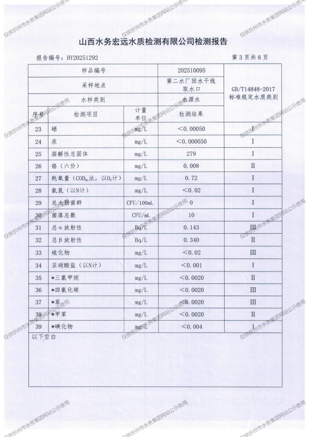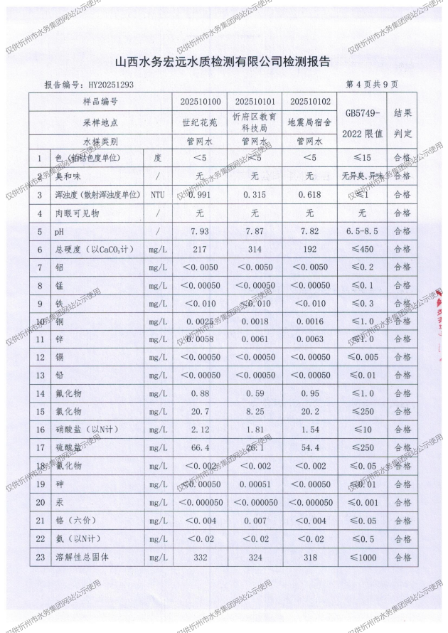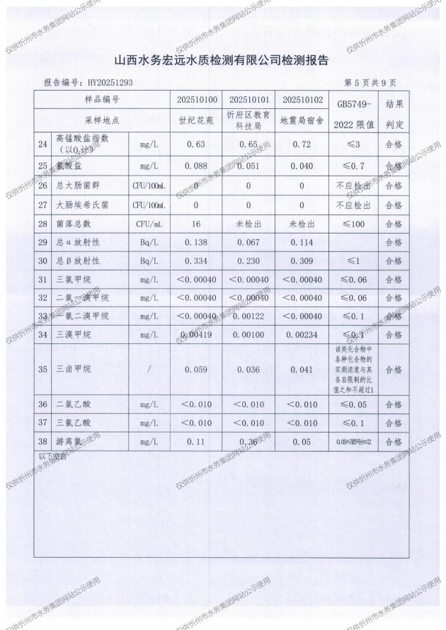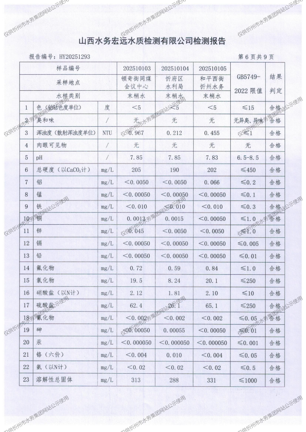 忻州城区公共供水水源水、出厂水、管网水、管网末梢水2025年10月份水质信息公示