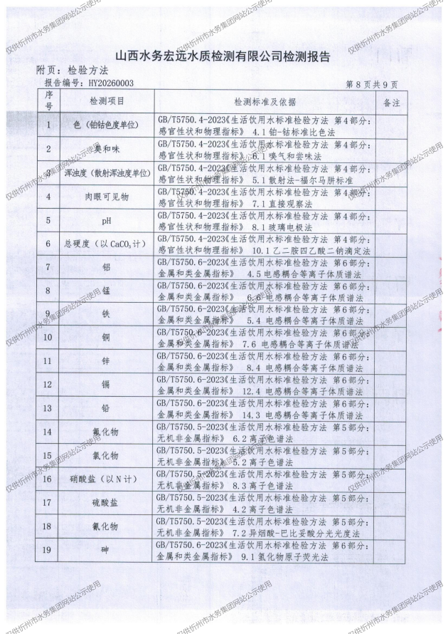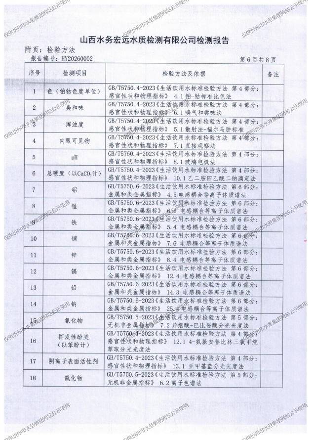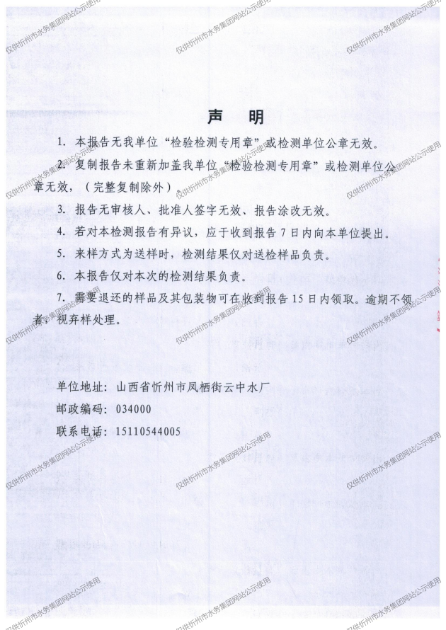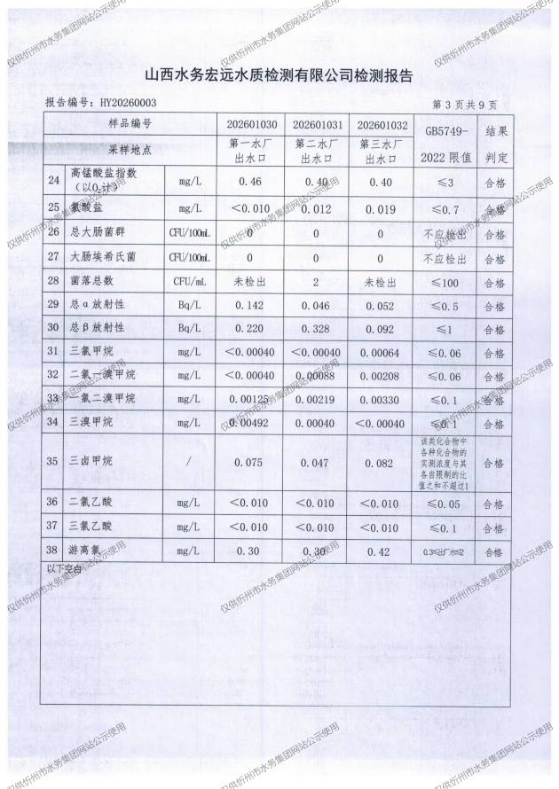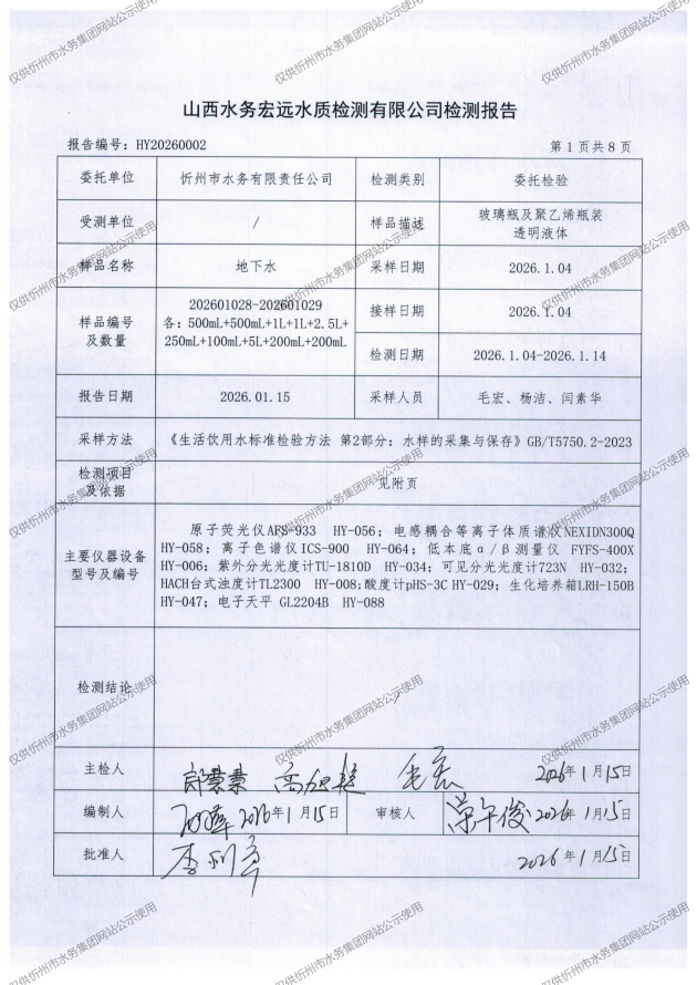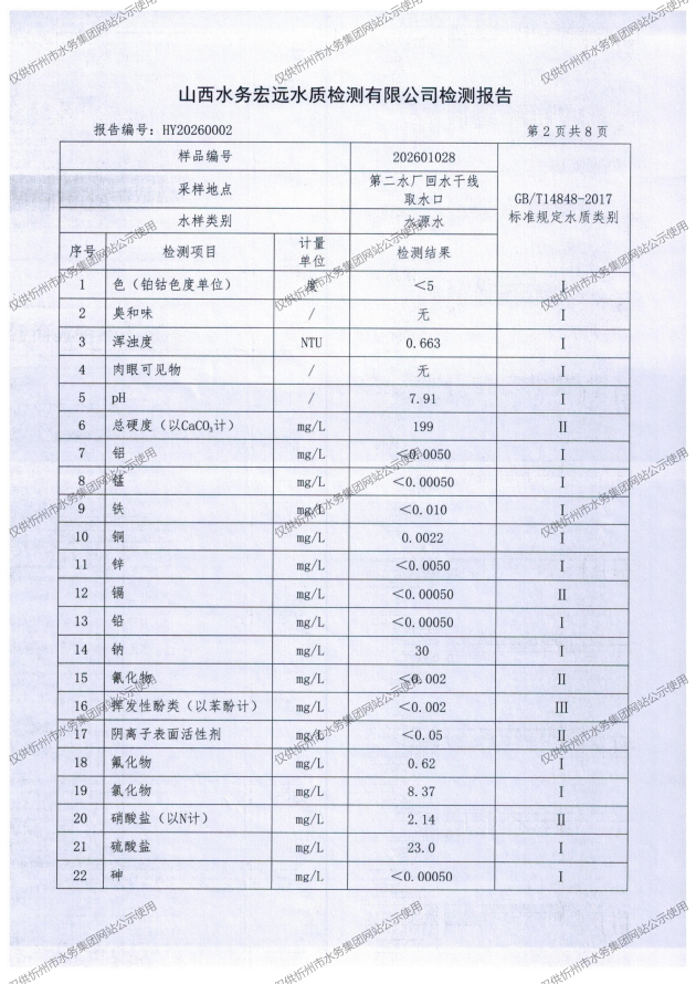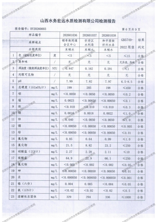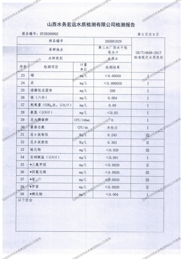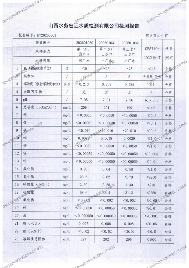 忻州城区公共供水水源水、出厂水、管网水、管网末梢水2026年1月份水质信息公示