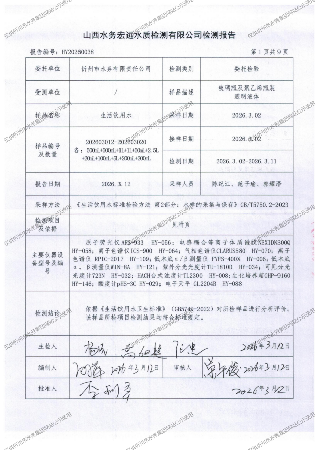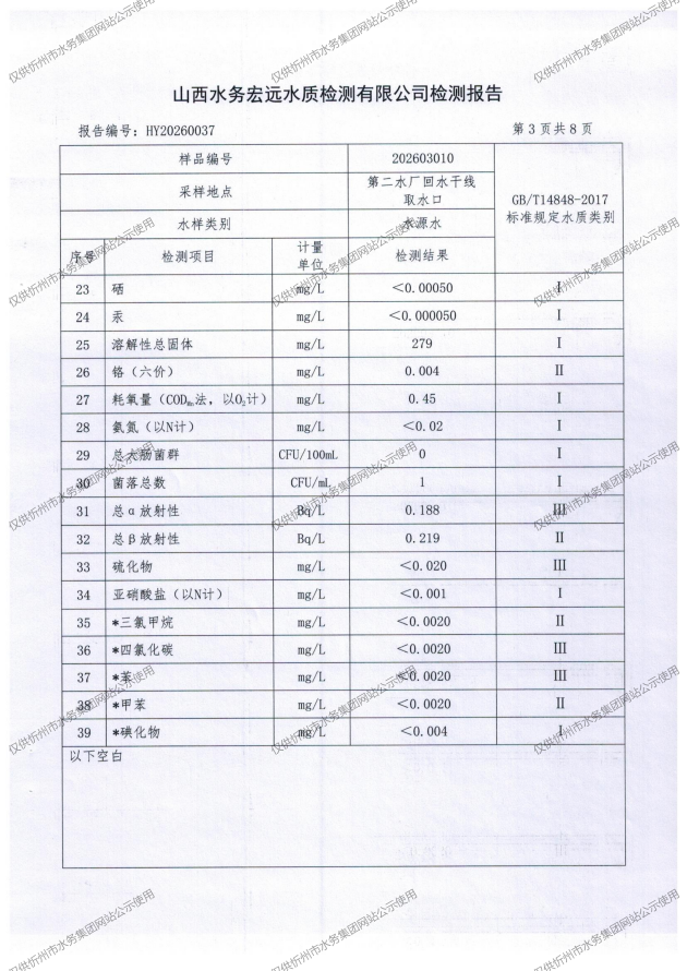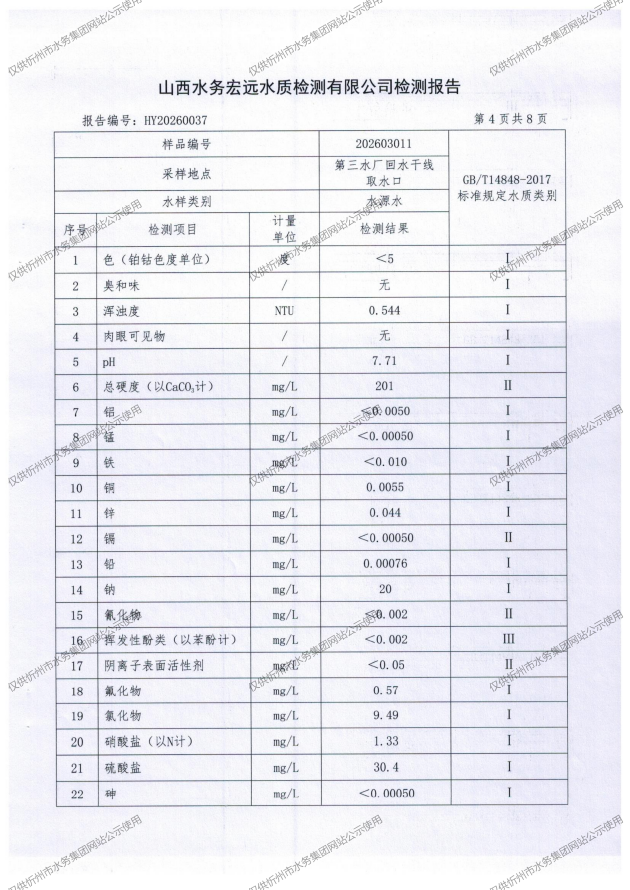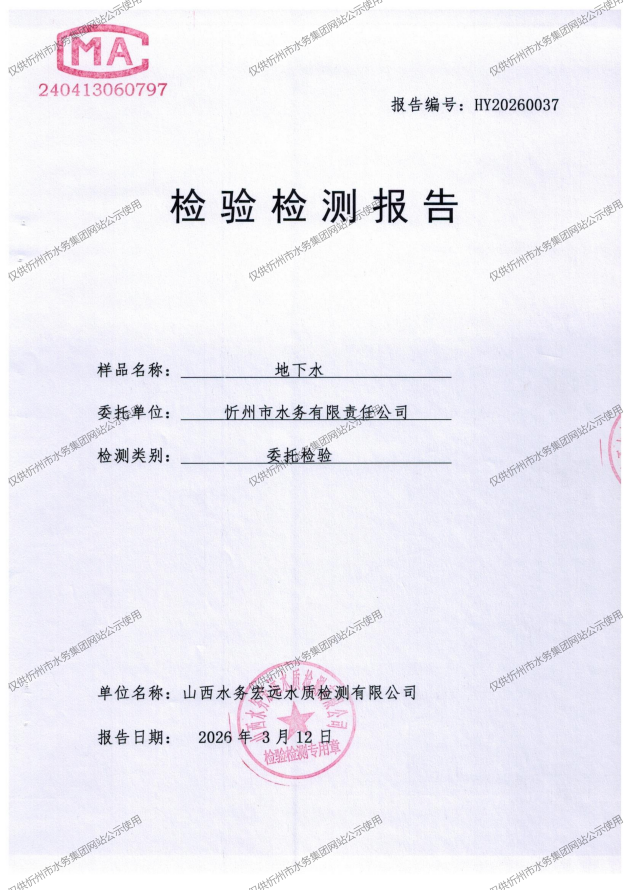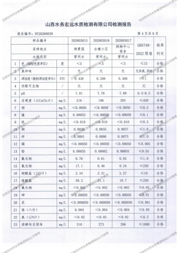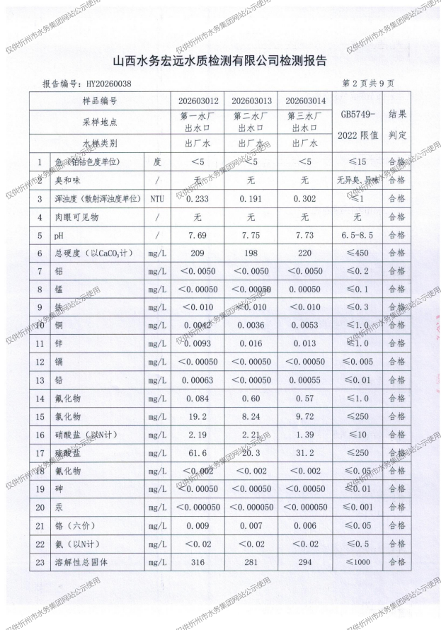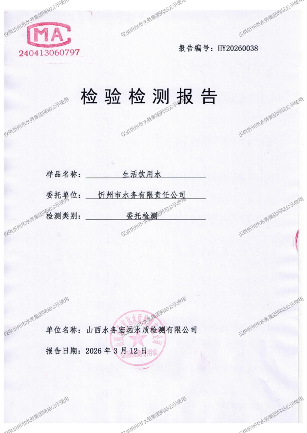 忻州城区公共供水水源水、出厂水、管网水、管网末梢水2026年3月份水质信息公示